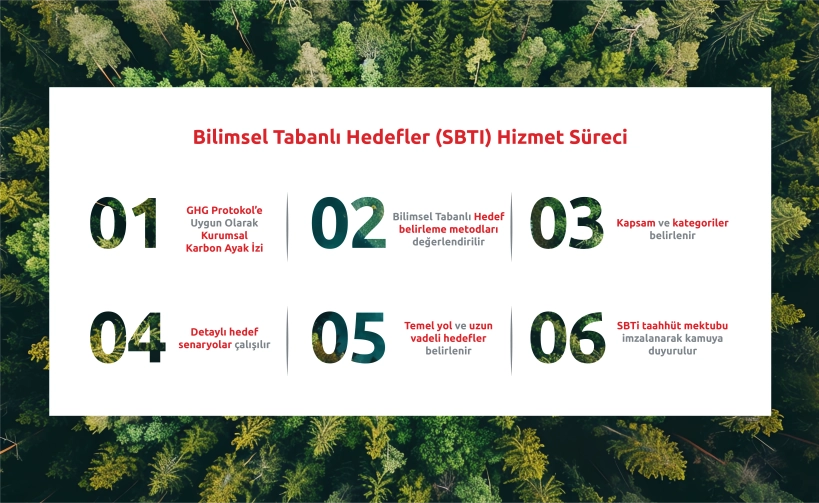 Küresel çapta en prestijli hedef belirleme kuruluşu olan SBTi metodolojisine uygun hedefin belirlenmesinde şirketinizin özel koşul, şart ve ihtiyaçlarını dikkate alarak belirlenecek hedefinizin resmi olarak yayınlanmasına kadar olan tüm süreci sizlerle beraber yürütüyoruz.